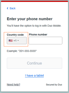 If you're going to use Duo Mobile on a tablet (like an iPad) with no phone service, don't enter a phone number and click "I have a tablet" instead.